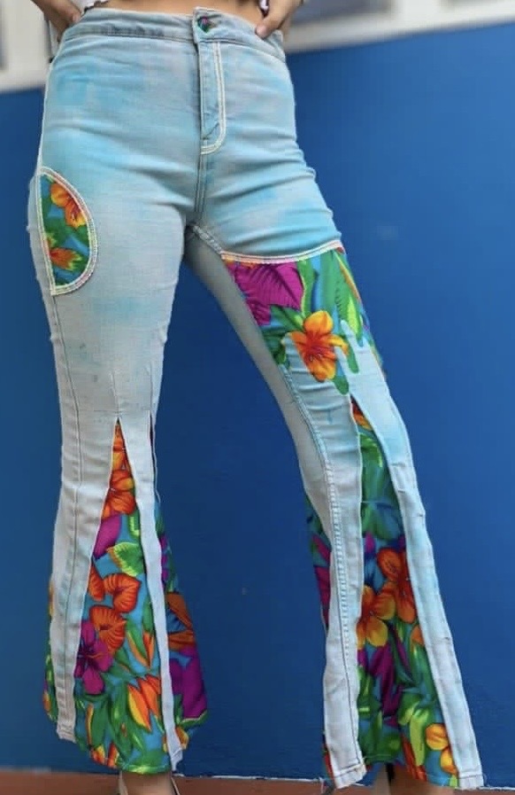 Pantalon jean customisé avec des morceaux de coton fleuri, de la dentelle et de la peinture textile.
