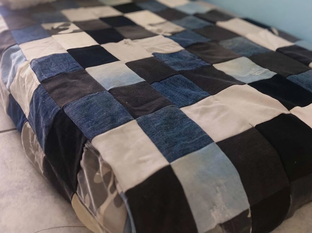 Couverture réalisée avec plusieurs jeans upcyclés.