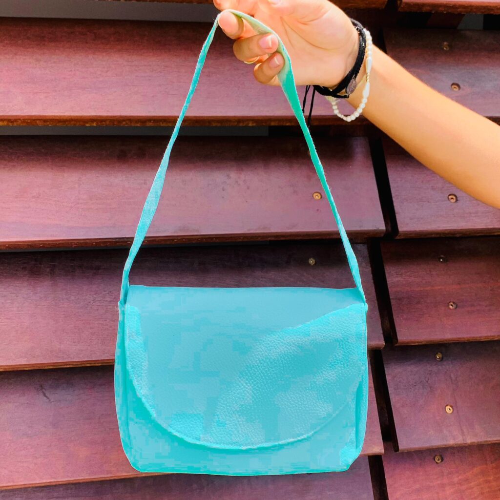 Sac à main en similicuir turquoise doublé avec un rabat.