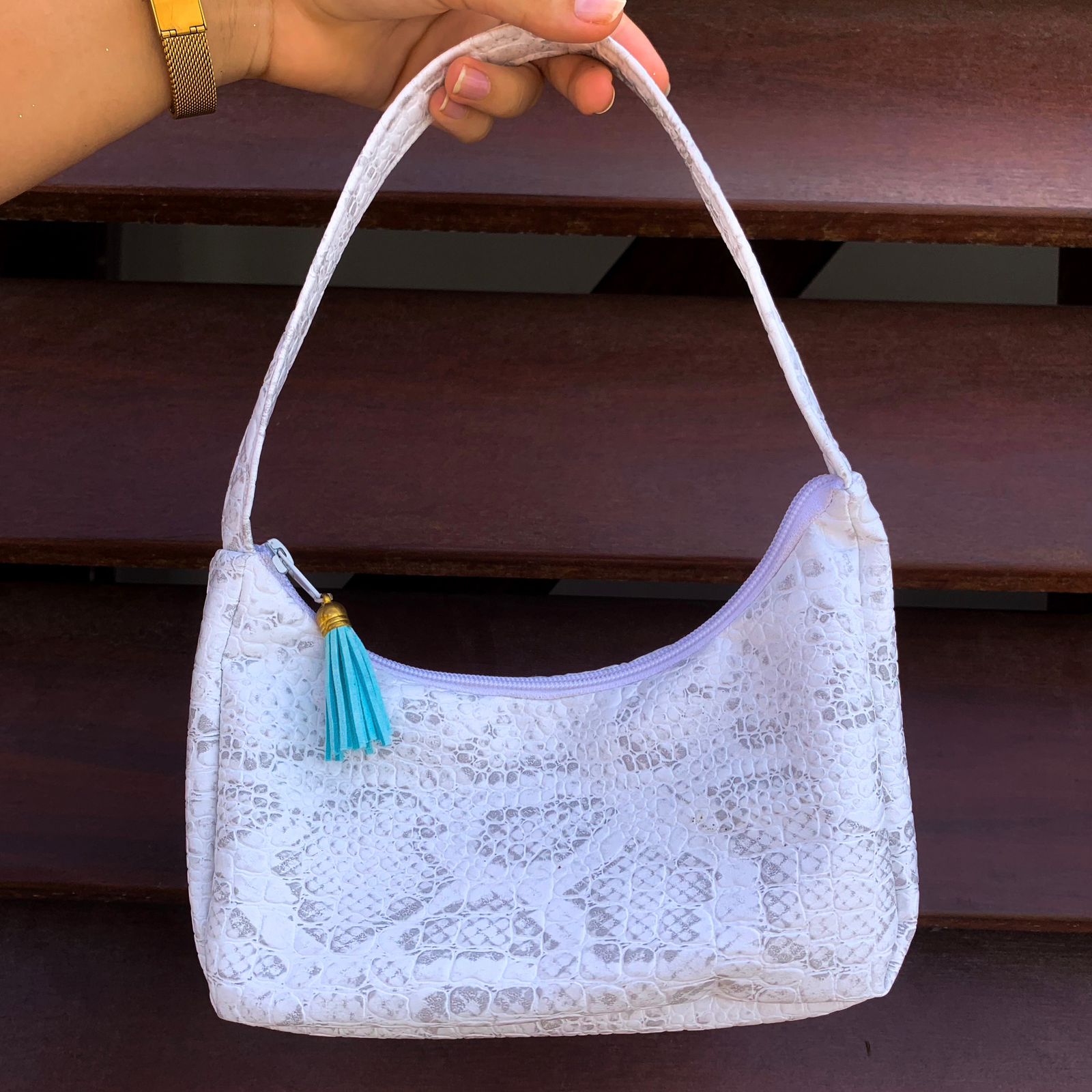 Sac à main similicuir blanc à motifs crocodile doublé. Pompon turquoise sur la fermeture à glissière.