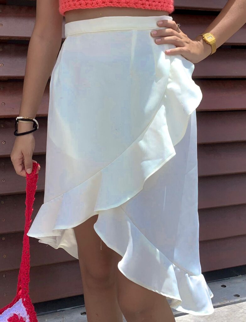 Jupe asymétrique blanche avec volants. Ceinture nouée dans le dos.