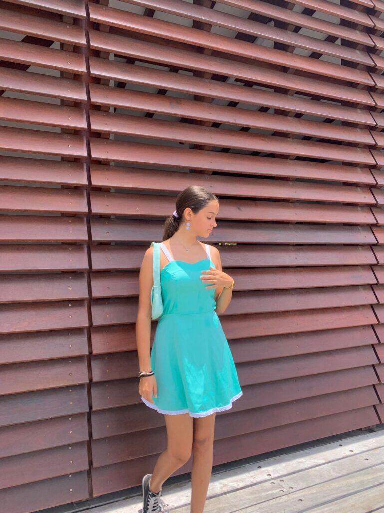 Robe en polyester turquoise, coupe princesse, jupe évasée, avec broderie anglaise en finition du bas et bretelles. Fermeture à glissière dans le dos.