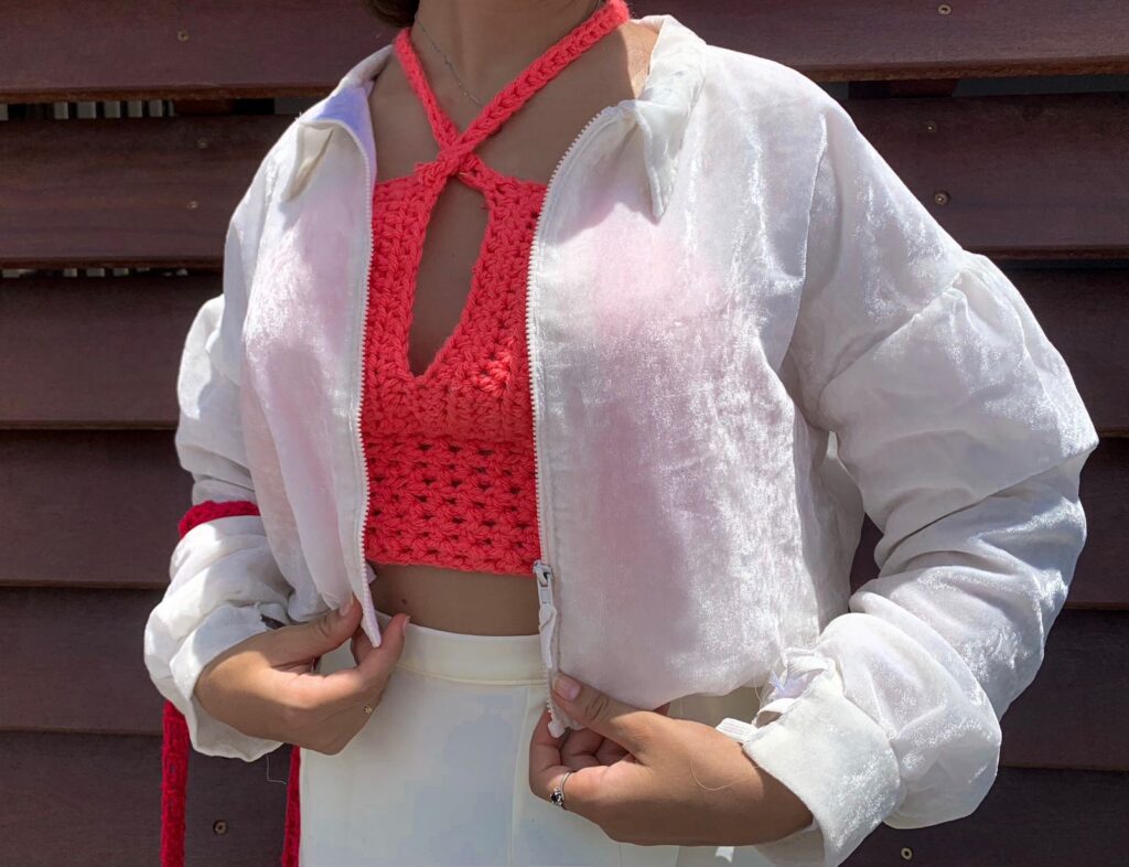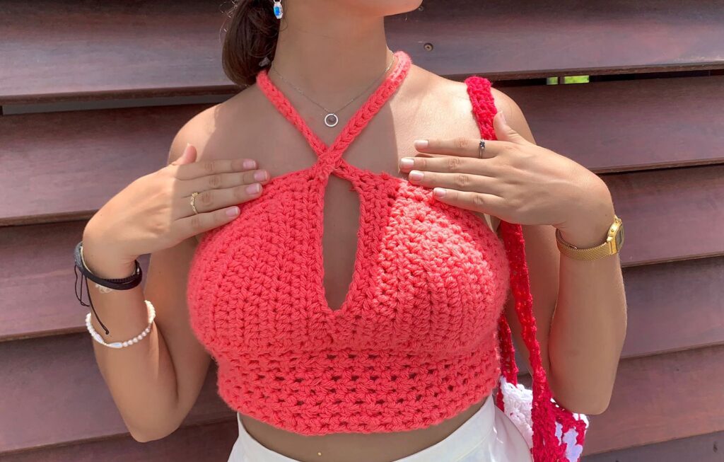 Top en laine acrylique couleur corail en demi-brides. Laçage dans le dos avec un ruban rose.
